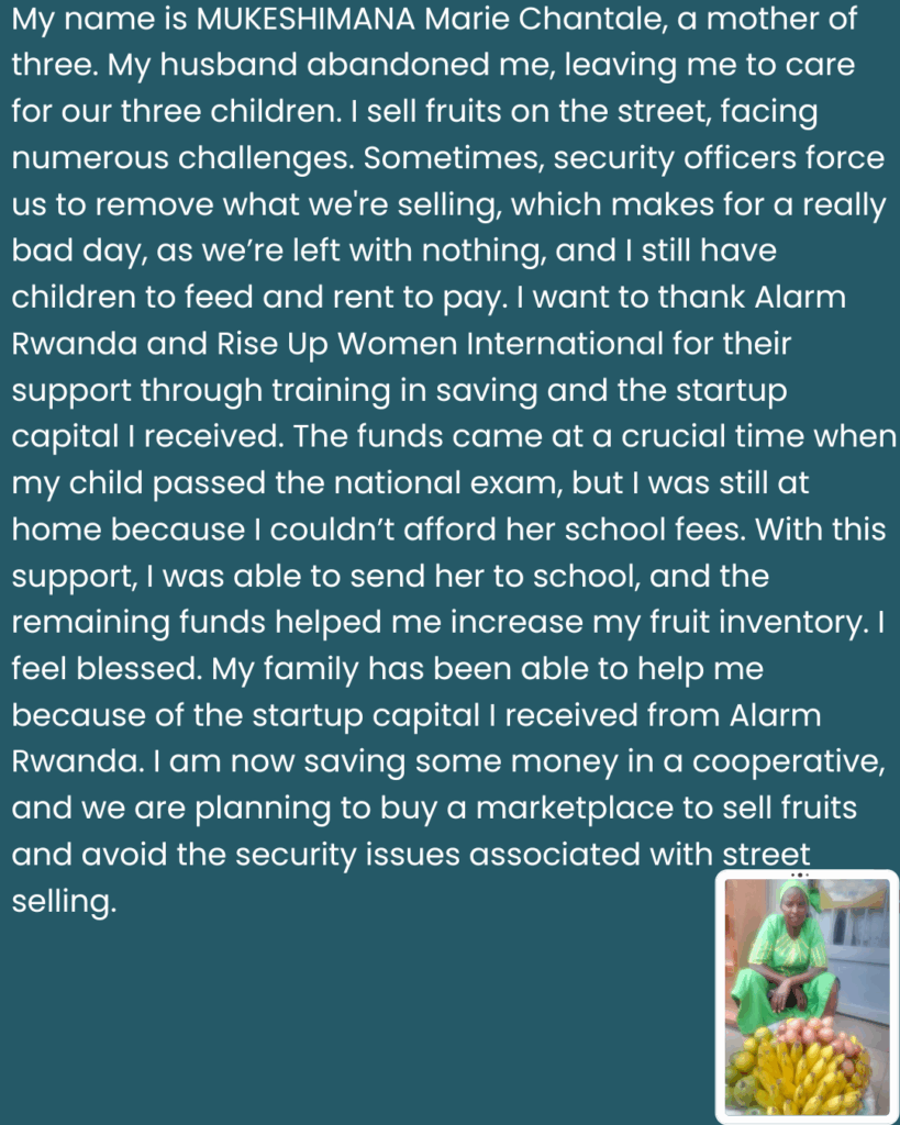 My name is MUKARUSINE Elda, mother of three children. I have been selling fruits from a small basket that circulates on the street. It has been difficult for me to feed and pay school fees for my children, and pay house rent. On the street, it is always difficult because you are chased by security officers who prohibit the sale of things on the street. Sometimes your goods are taken and you have nothing, you need capital to restart again, and yet you have bills to pay. I want to thank Alarm Rwanda and Rise up women international that through economic empowerment training I received and the start-up capital got, I increased the goods variety of fruits which allowed me to request for a small market place from my neighbors where am selling my fruits and my customers are satisfied because they can get more than one variety of fruits.  I am very thankful that now don’t fear security on the street and that my goods will not be taken.